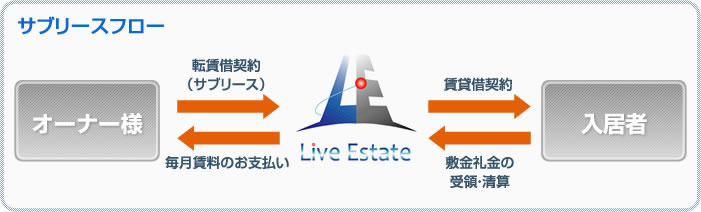 お手持ちの物件(お部屋)をリブエステートが一括で借り上げ、入居者募集~入居~退去まで原状回復リフォームまで全ての管理業務を当社が実施させていただくプランです。遠くにお住まいで関西に物件をお持ちになりたい方や物件のメンテナンス等管理業務が煩わしく思われている方や入居者の確保による安定した賃料収入を求めている方にはお薦めのシステムです。